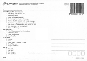 "Australian Collectors Choice"![]() Generische Karte mit eingedrucktem Text unten rechts / Generic Card with printed-in townname on bottom right Vermutlich ab ca. 1990 wurde die Rückseite schwarz gedruckt. Die Vorderseite blieb unverändert. Der Ortsname ist an verschiedenen Stellen der Karte eingedruck. / The back was printed in black from probably around 1990. The front remained unchanged. The location name is printed in various places on the card. siehe Übersicht / see overview |