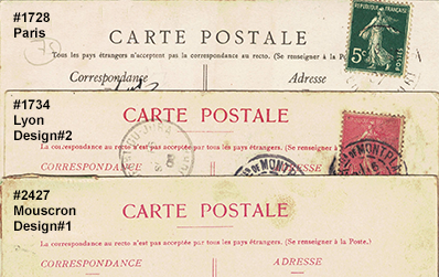 Für Lyon gab es dieses Design für den lokalen Verlag "P. Martel" mit Häusern in den Buchstaben. Da dieses Design dem Design #1 sowohl auf der Vorderseite als auch von der Rückseite so ähnlich ist, darf man davon ausgehen, dass diese Karte ebenfalls von Van Cortenbergh gedruckt wurde und vielleicht auch die Idee zu den generischen Karten von Design #1 gab. Ein weiteres Indiz ist, dass die einzige Karte von Design #1, die nicht aus einem Ort in Nordfrankreich bzw. Belgien ist, aus Tarare ist - einem Vorort von Lyon. / For Lyon, there was this design for the local publisher "P. Martel" with houses in the letters. Since this design is so similar to design #1 on the front as well as from the back, one may assume that this card was also printed by Van Cortenbergh and perhaps also gave the idea for the generic cards of Design #1. Another indication is that the only card of design #1, which is not from a location in northern France or Belgium, is from Tarare - a suburb of Lyon.