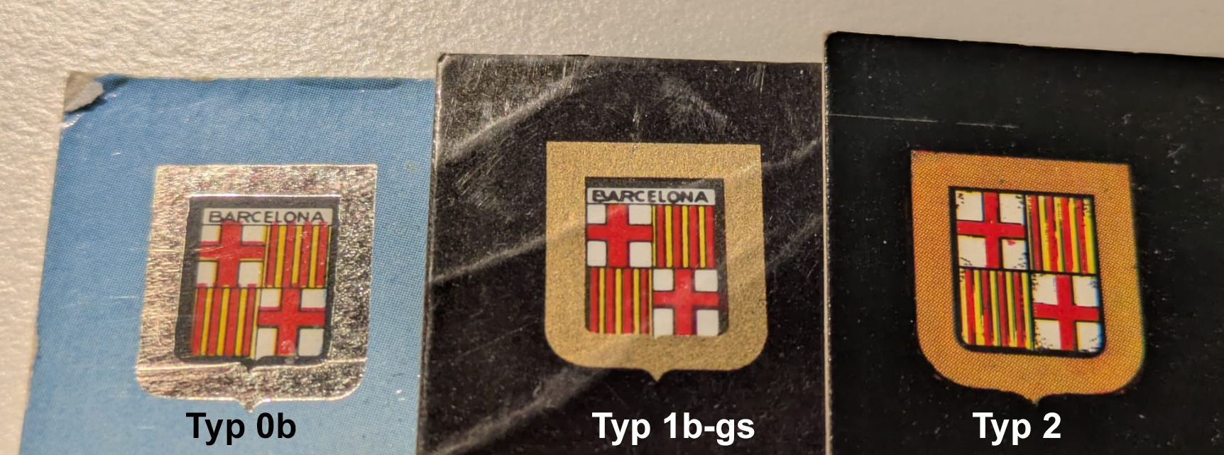 Die erste Version des "Escudo de Oro" gab es bereits Anfang der 1960er Jahre. Wie auch in den späteren Jahren und Wappen-Versionen, gab es sie ohne ("a") und mit ("b") Ortsnamen. Der Rand des Wappens wurde wie eine Veredlung in glänzendem Gold auf die Karten gedruckt. Hier der direkte Vergleich zwischen glänzende Veredlung ("Typ 0b"), goldene Sonderdruckfarbe ("Typ 1b-gs") und gerastert ("Typ 2"). / The first version of the "Escudo de Oro" already existed at the beginning of the 1960s. Like in later years and versions, the golden shieds exist without ("a") and with ("b") location name. The border of the shield was printed on the cards in shiny gold as a finishing touch. Here the direct comparison between shiny finishing ("type 0b"), golden spot color ("type 1b-gs") und halftone screening ("type 2").