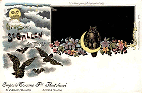 Mit zwei Eulen statt Escher-Denkmal wurden mind. 8 weitere Karten für Orte in der Schweiz (in deutsch und französisch) herausgebracht: / With two owls instead of the monument-silhouette at least 8 further cards for locations in Switzerland (in German or French) were issued: (452: Biel, 452: Solothurn, 453: Lausanne, 454: ???, 455: Neuchâtel, 456: Fribourg, 457: Genève, 458 St.Gallen, 459: Appenzell.) Die Ortsnamen sind immer Teil des Lithos und nicht nachträglich eingedruckt. Anders als bei Karten von den Verlagen Metz oder Lederbogen ist der Ortsname über dem schwarzen Bild ein zweites Mal angegeben. Inhaltlich unterscheiden sich die Bedeutungen. Im deutschen "Gruss aus... " und "... neueste Aufnahme", im französischen "Souvenir von" und "Skizze von ...". / The place names are always part of the litho and not imprinted afterwards. Unlike cards from the publishers Metz or Lederbogen, the place name is indicated a second time above the black image. In terms of content, the meanings differ. In the German "Greetings from... " and "... latest photograph", in French "Souvenir from" and "Sketch from ...". ![]() Den Vertrieb der Karten von H.Guggenheim übernahm später Bertolucci. Dies wurde dann nachträglich auf die Karten eingedruckt: / The distribution of the cards from H.Guggenheim was later taken over Bertolucci. This was then later printed on the cards: "Emporio Toscano Flli Bertolucci S.Paolo (Brasile) Lucca (Italia)" Beispiele/Examples: Biel & St.Gallen.