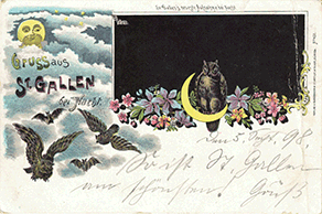 | Das Atelier von Lithograf Hermann Guggenheim erstellte seit 1893 Ansichtskarten. Ca. 1897 veröffentlichte Guggenheim die erste "bei Nacht" Postkarte: für Zürich mit einer schwarzen Silhouette des Escher-Denkmals in Zürich. Gedruckt wurden die Karten bei Philipp Frey & Co. in Frankfurt/Main. / The studio of lithographer Hermann Guggenheim produced postcards since 1893. About 1897, his publishing house issued the first "by night" postcard: for Zurich with a black silhouette of the monument for Escher in Zurich. These cards were printed from Philipp Frey & Co. in Frankfurt/Main. |