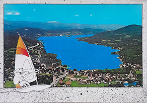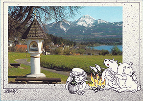 For Lake Faak, a typical view of Lake Faak with a wayside shrine (similar to the one in design #1) in the foreground and the mountains (Mittagskogel) in the background was brought out as a silouette.