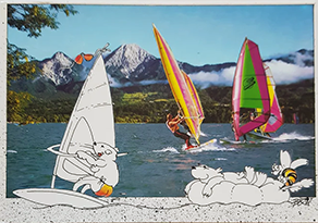 The graphic of the marmot on a surfboard is by "Wiesner & Borioni, Grafik Montabella, St. Moritz", even though they are not mentioned on the card itself.