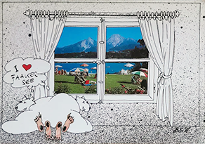 Für den Faaker See wurde eine typische Ansicht des Faaker Sees mit Bildstock (ähnlich zu Bildstock in Design #1) im Vordergrund und den Bergen (Mittagskogel) im Hintergrund als Silouette herausgebracht. /