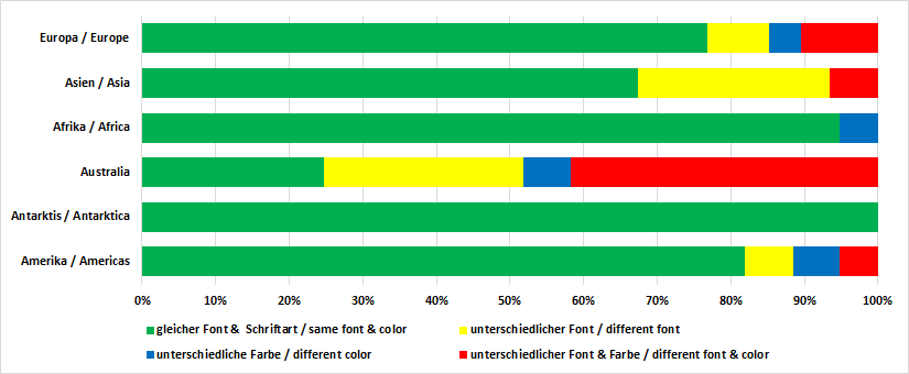 Verteilung nach Unterschieden in Schriftart und Farbe des Ortsnamens und des "bei Nacht" Textes pro Kontinent / Breakdown by Difference of font and color of the location name and the "by Night" text per Continent