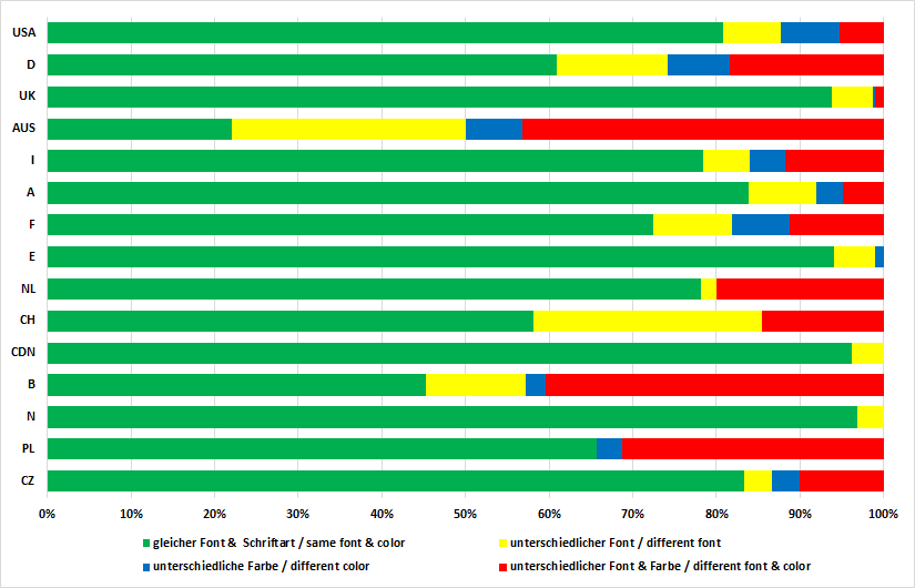 Verteilung nach Unterschieden in Schriftart und Farbe des Ortsnamens und des "bei Nacht" Textes pro Top Land / Breakdown by Difference of font and color of the location name and the "by Night" text per Top Country
