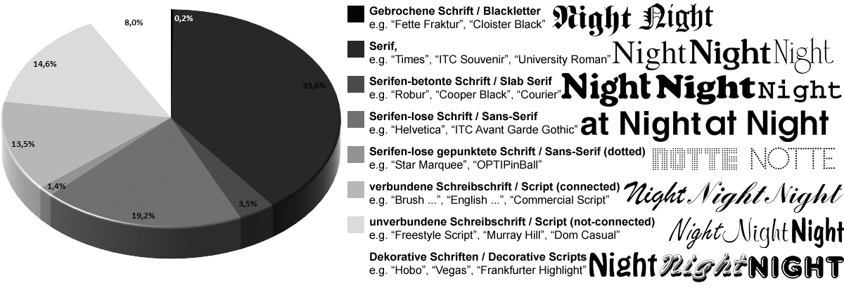 Verteilung nach Schriftkategorie des 'Bei Nacht'-Texts / Breakdown by Font Class of the 'by night' text