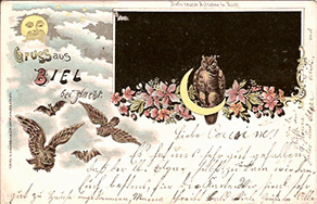 | Das Atelier von Lithograf Hermann Guggenheim erstellte seit 1893 Ansichtskarten. Ca. 1897 veröffentlichte Guggenheim die erste "bei Nacht" Postkarte: für Zürich mit einer schwarzen Silhouette des Escher-Denkmals in Zürich. Gedruckt wurden die Karten bei Philipp Frey & Co. in Frankfurt/Main. / The studio of lithographer Hermann Guggenheim produced postcards since 1893. About 1897, his publishing house issued the first "by night" postcard: for Zurich with a black silhouette of the monument for Escher in Zurich. These cards were printed from Philipp Frey & Co. in Frankfurt/Main. |